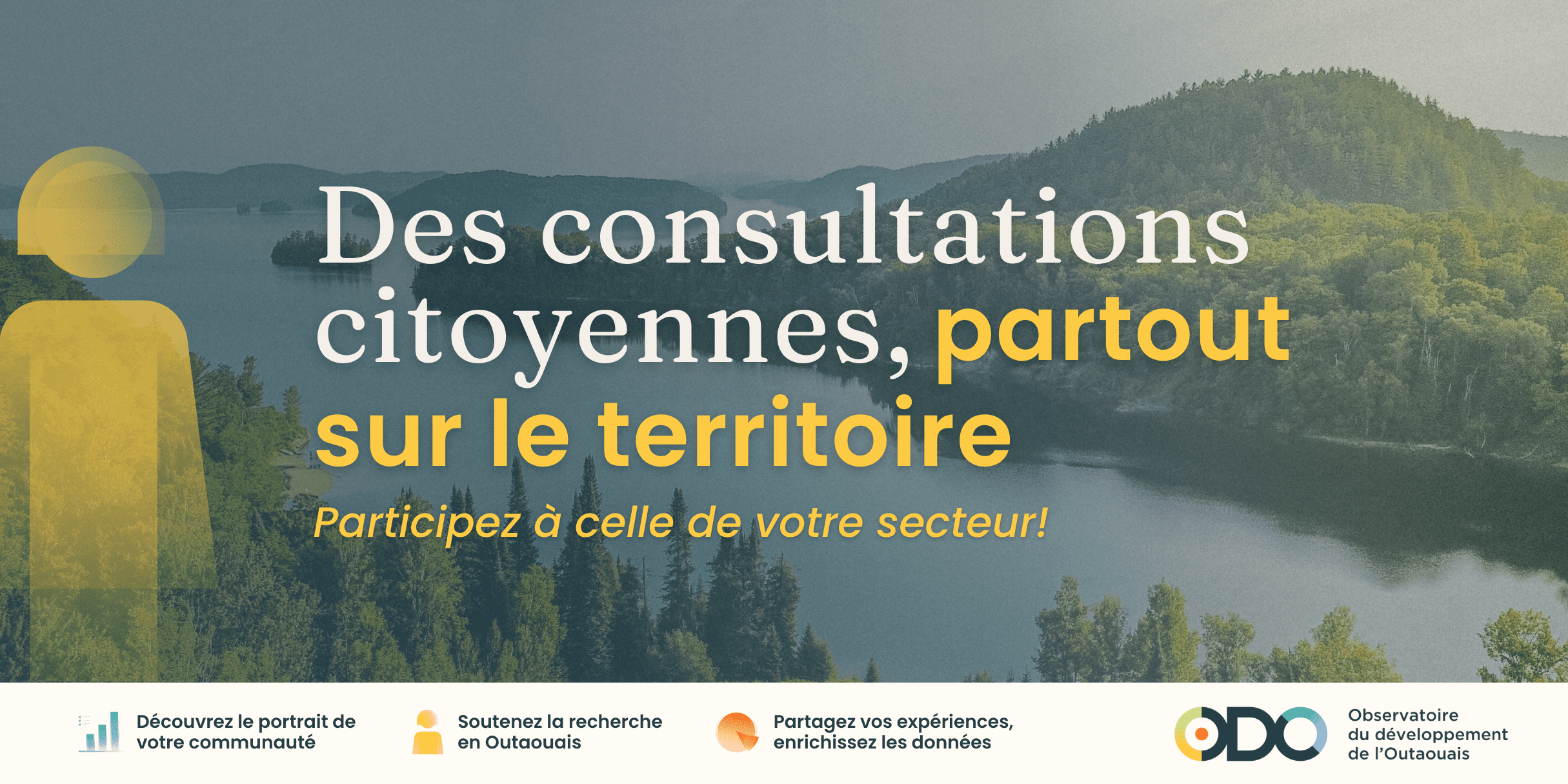 L'Observatoire du développement de l'Outaouais invite les citoyens et citoyennes à participer aux consultations dans leur secteur. Ces rencontres permettent de partager vos idées, préoccupations et suggestions afin d'aider les organismes, municipalités et décideurs à orienter leurs actions pour améliorer la qualité de vie dans votre communauté.
