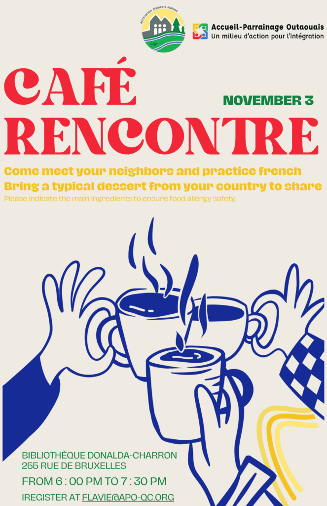 As part of Quebec Week of Intercultural Encounters, the Association of the residents of the Plateau and Accueil-Parrainage Outaouais invite you to a coffee gathering on Monday, November 3, from 6:00 to 7:30 p.m. at the Donalda-Charron Library.