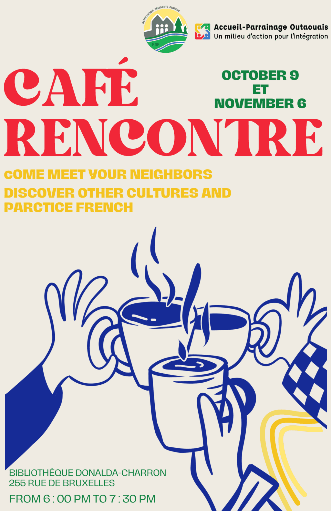 In collaboration with Accueil-Parrainage Outaouais, the cafés-rencontre are back! These friendly gatherings will take place at the Donalda-Charron Library on Thursday, October 9 and Thursday, November 6, from 6:00 to 7:30 p.m.