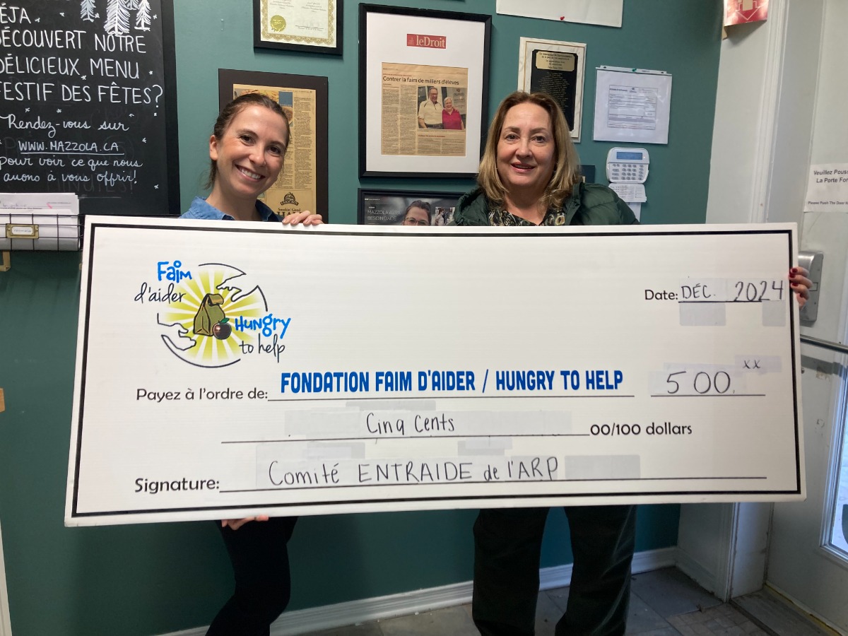 The ARP Aid Committee has made a generous donation to the Hungry to help Foundation. The Association of Plateau Residents contributed $500 to this foundation, which provides hot meals to children in need in schools across the region. Every $5 donated provides one meal for a child. The meals are prepared by Mazzola, located at 304 Vanier Road in Aylmer.