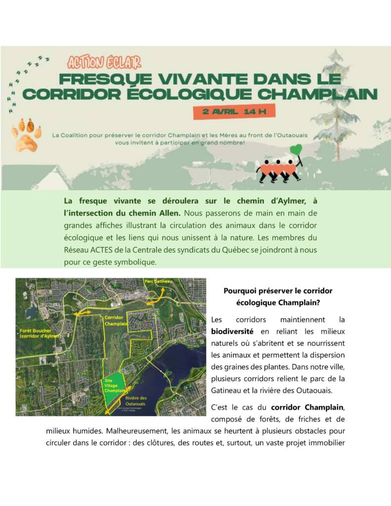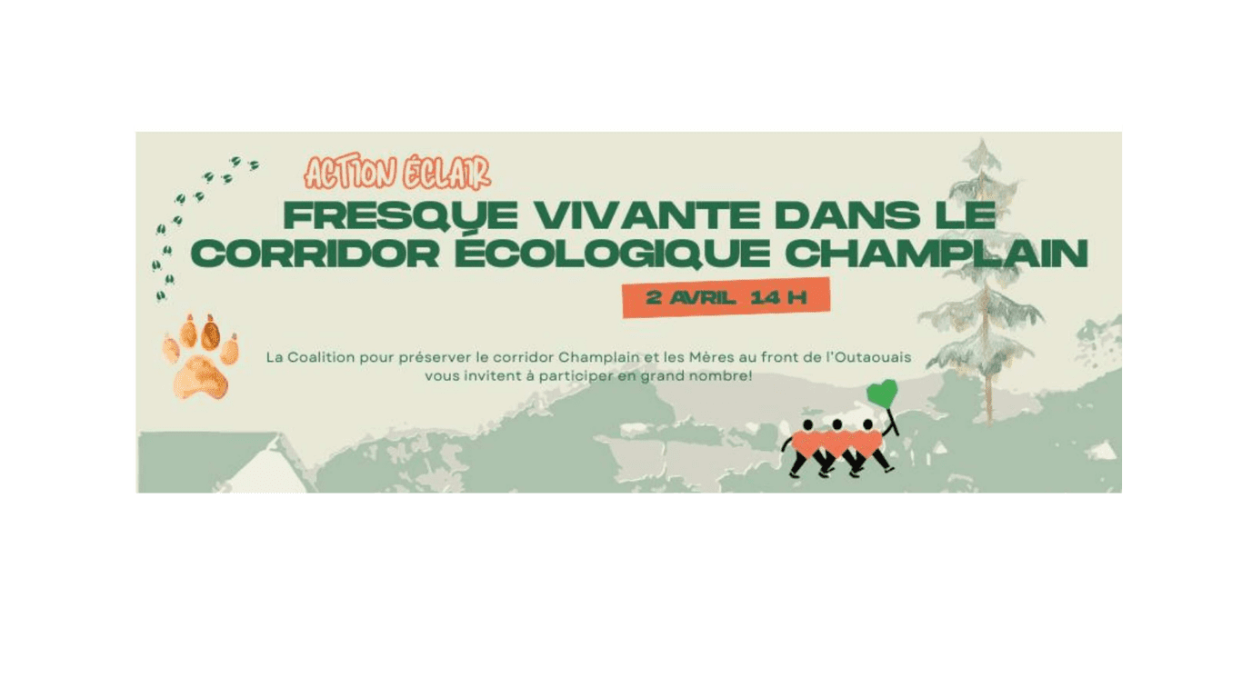 La coalition pour préserver le corridor écologique Champlain et les Mères au front de l'Outaouais vous invitent à participer à une fresque vivante le 2 avril à 14 heures sur le chemin d'Aylmer à l'intersection du chemin Allen. De grandes affiches illustrant la circulation des animaux dans le corridor écologique seront remises aux participants.