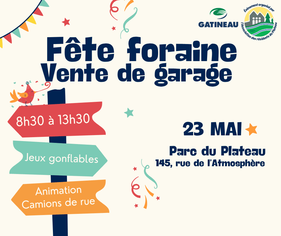 La Fête foraine et vente de garage du Plateau revient le samedi 23 mai 2026, de 8 h 30 à 13 h 30, au parc du Plateau (145, rue de l'Atmosphère).