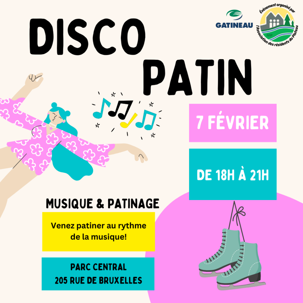 Venez patiner au rythme de la musique lors de notre Disco Patin, le 7 février 2026, de 18h à 21h, à la patinoire du Parc Central.