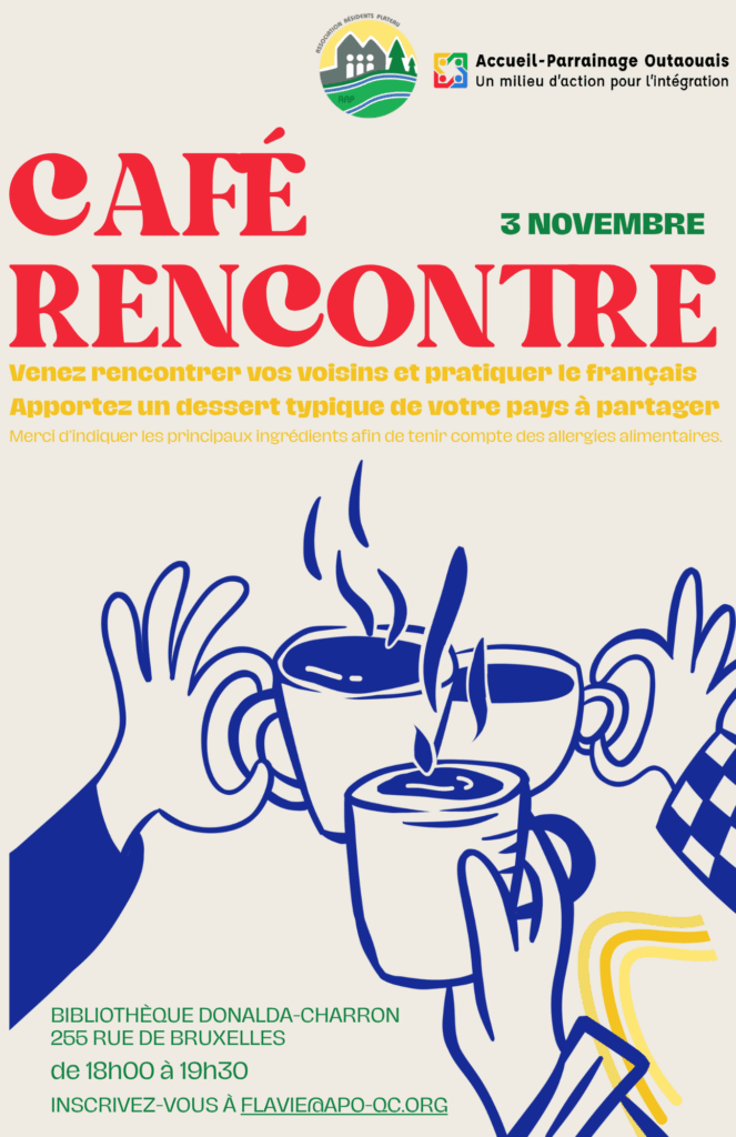 Dans le cadre de la Semaine québécoise des rencontres interculturelles, l'Association des résidents du Plateau et Accueil-Parrainage Outaouais vous invitent à un café-rencontre le lundi 3 novembre, de 18 h à 19 h 30, à la Bibliothèque Donalda-Charron.