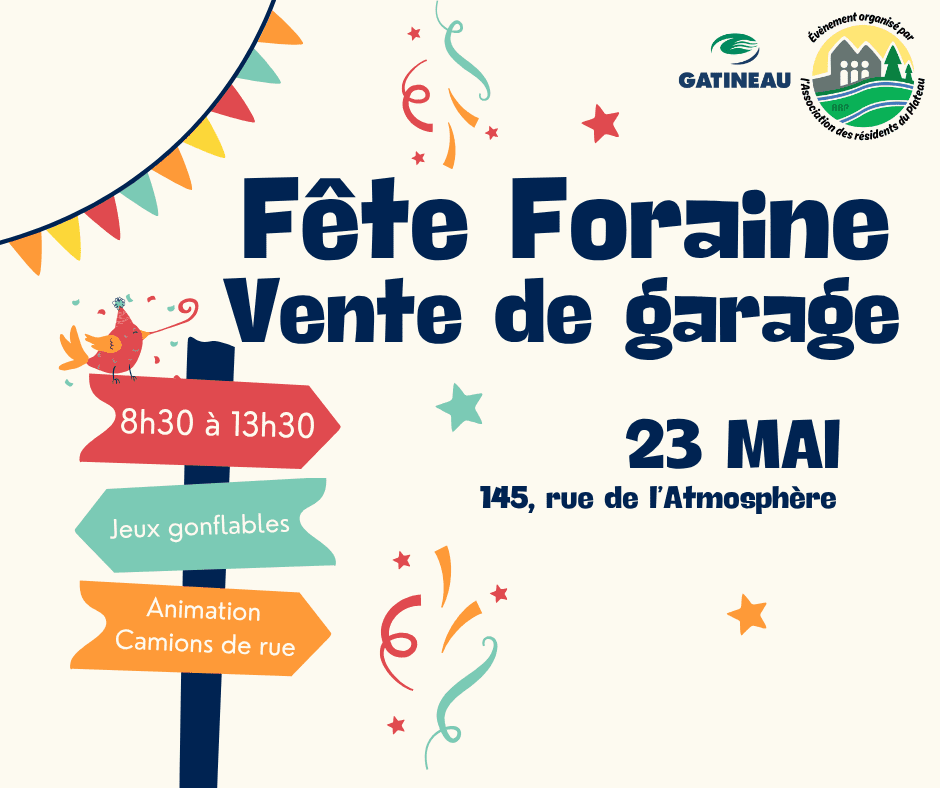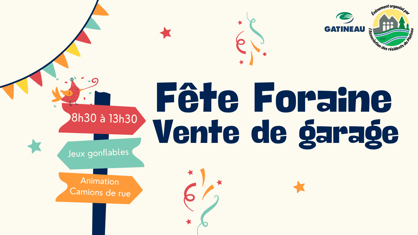 Le 23 mai 2026*, de 8 h 30 à 13 h 30, le Parc du Plateau accueillera de nouveau la Fête foraine et vente de garage du Plateau.